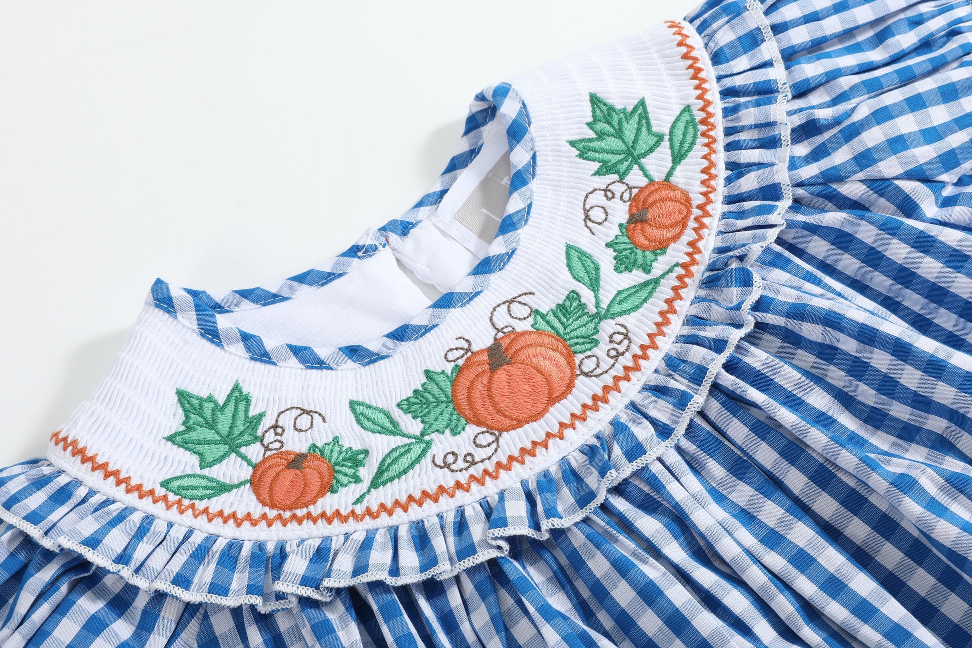 Pretty for Fall! This Blue Gingham Pumpkin Smocked Ruffle Bishop Dress by Lil Cactus features cute pumpkin embroidery, smocking along the neckline that is detailed with an adorable ruffle. Made in 100% soft cotton to ensure your sweet girl is comfortable all day long. The perfect outfit for your cutie and all of her fall adventures. From playing in leaves to walking around the pumpkin patch; no matter the occasion she will be looking picture-perfect!