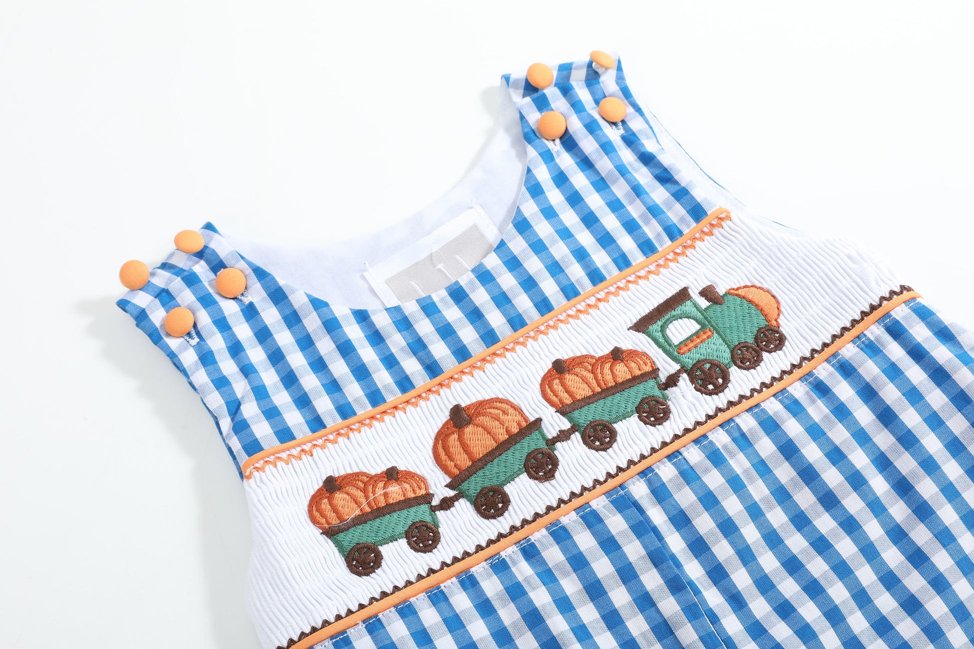 These Blue Gingham Pumpkin Train Smocked Overalls by Lil Cactus are a charming choice for your little boy this Fall season. Detailed with smocking at the chest with adorable pumpkin and train embroidery. Buttons at the shoulder ensure adjustable sizing, while snap enclosures make diaper changes quick and easy. Perfect for Thanksgiving gatherings, family photos, and visits to the pumpkin patch. These overalls will keep your little turkey cozy and stylish all season long.