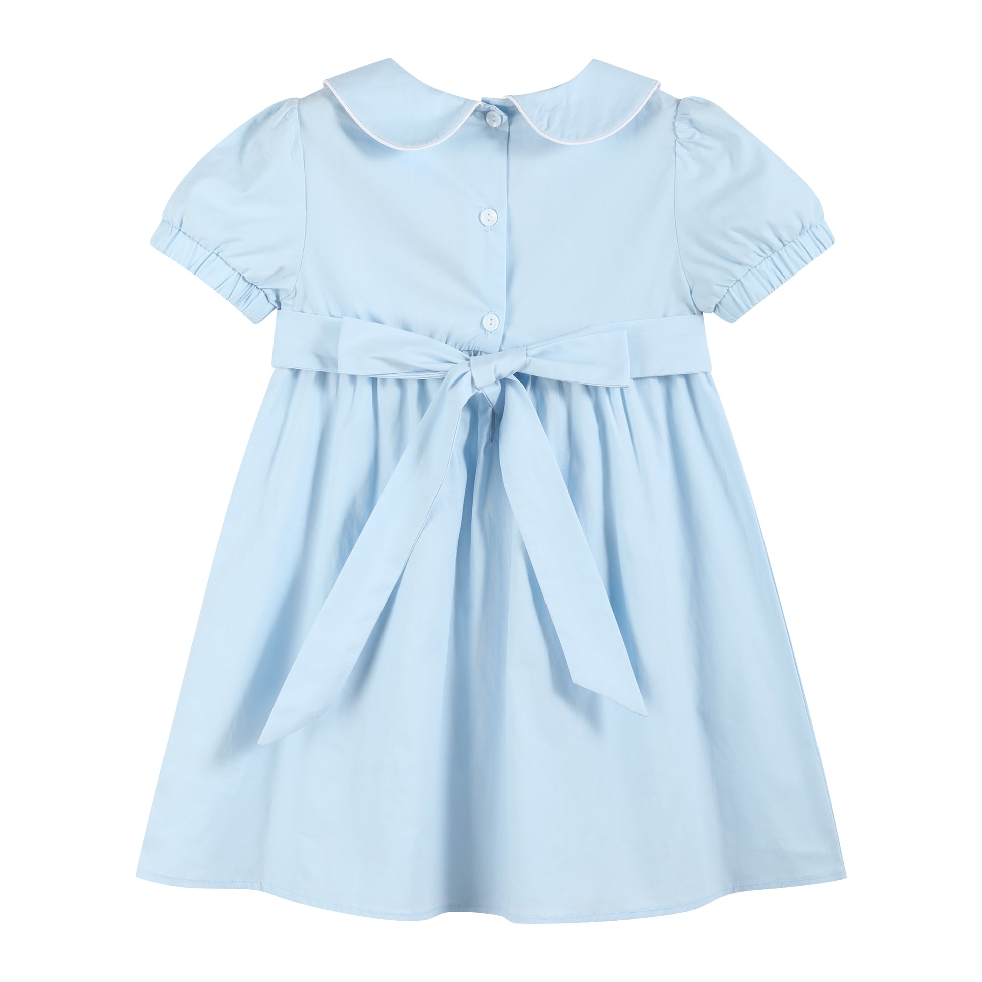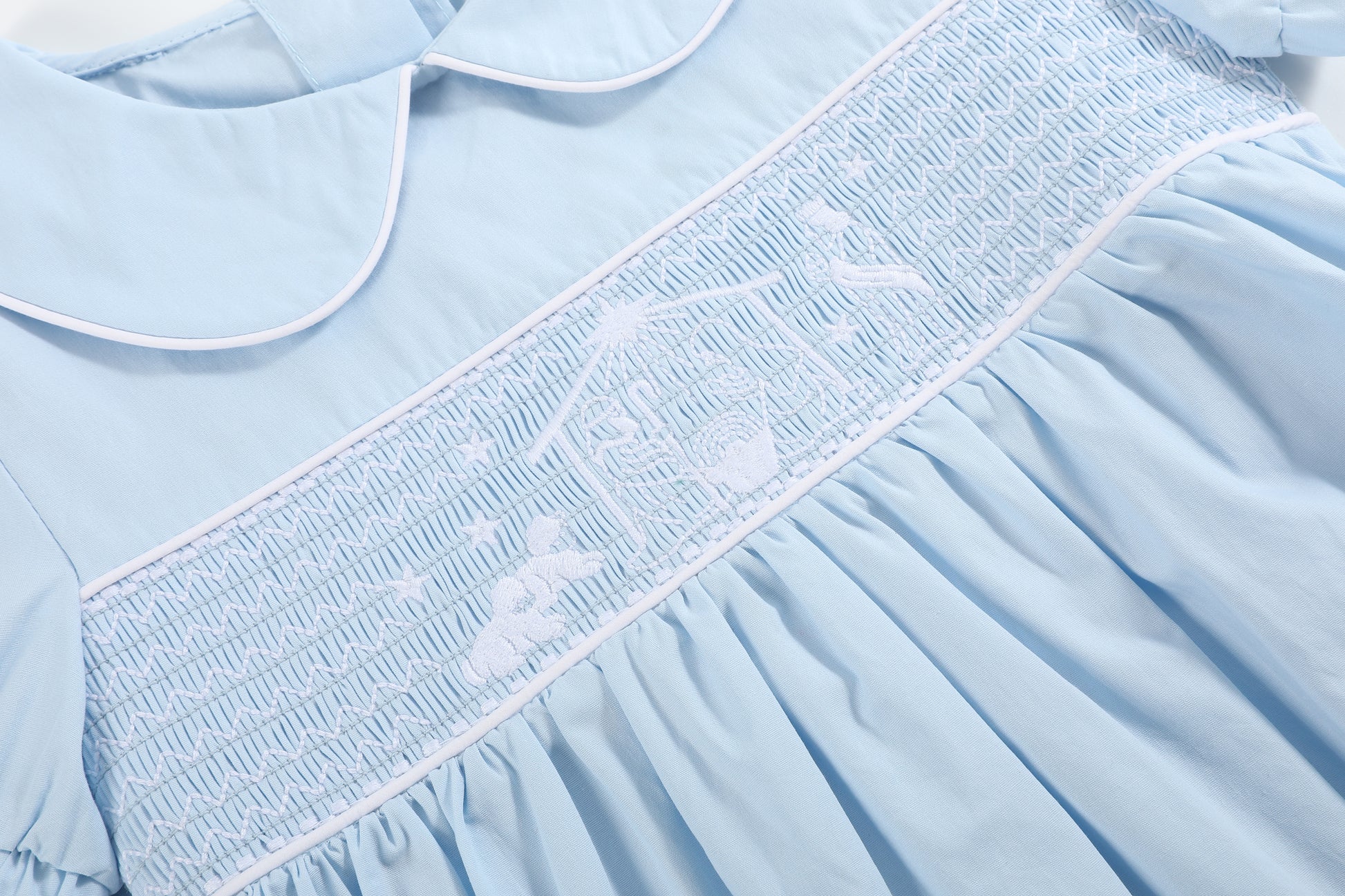 Charming for Christmas! This beautiful Light Blue Nativity Dress by Lil Cactus features pretty nativity embroidery, a peter pan collar, a tie-up bow back, and smocking. Made in 100% soft cotton ensure your little sweetie is comfortable all day long. A beautiful outfit for your little one as she celebrates the true spirit of Christmas. Whether attending a nativity play, visiting the Christmas market, or sharing memories with loved ones, she’ll look picture-perfect for every festive moment.