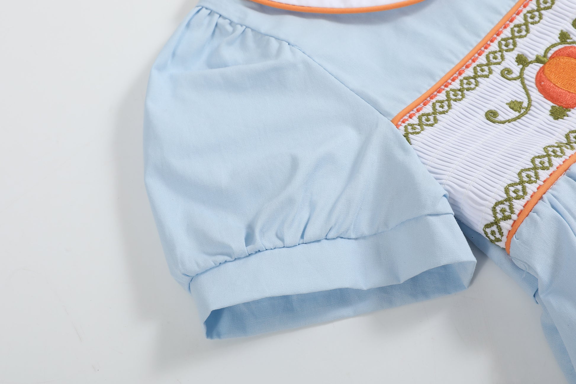 This Light Blue Pumpkin Vine Smocked Dress is a perfect choice for the Fall season. The smocked bodice is embroidered with adorable pumpkin and vines, adding a playful touch. Made from 100% cotton, the dress is both warm and breathable. Piping trim on the collar enhances its classic appeal, while the tie bow on the back and back buttons ensure easy wear. It’s perfect for Fall gatherings, apple picking, pumpkin patches, and cozy celebrations.