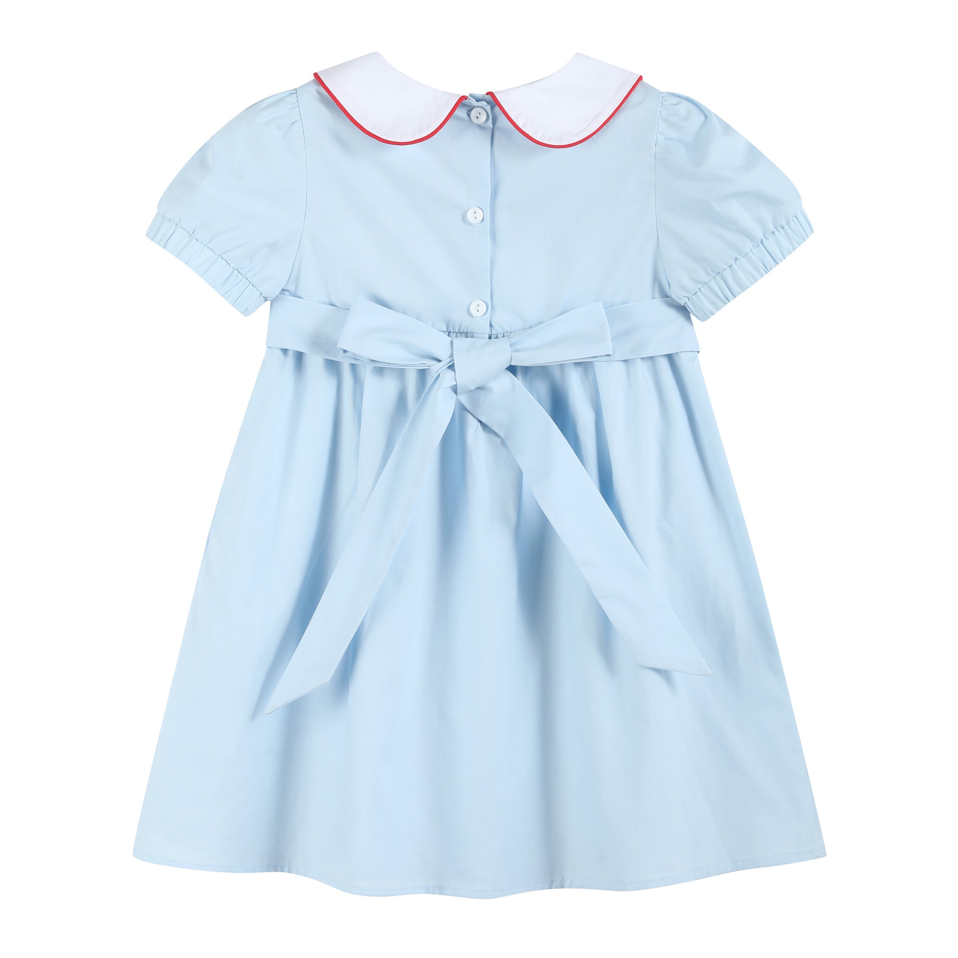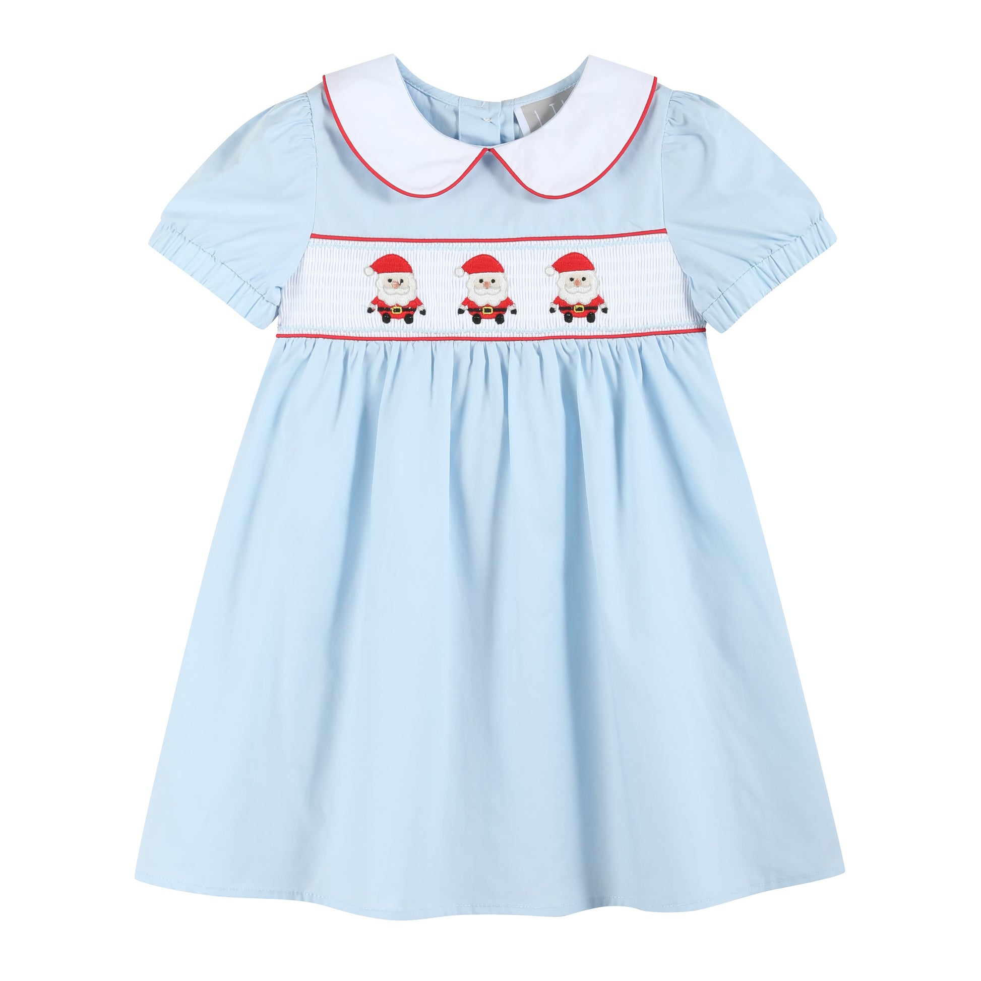 This Light Blue Santa Smocked Dress is a cozy and charming choice for the holiday season. The smocked bodice is embroidered with festive Santas, adding a playful touch. Made from 100% cotton, the dress is both warm and breathable. Piping trim on the collar enhances its classic appeal, while the tie bow on the back and back buttons ensure easy wear. Perfect for winter gatherings and celebrations.