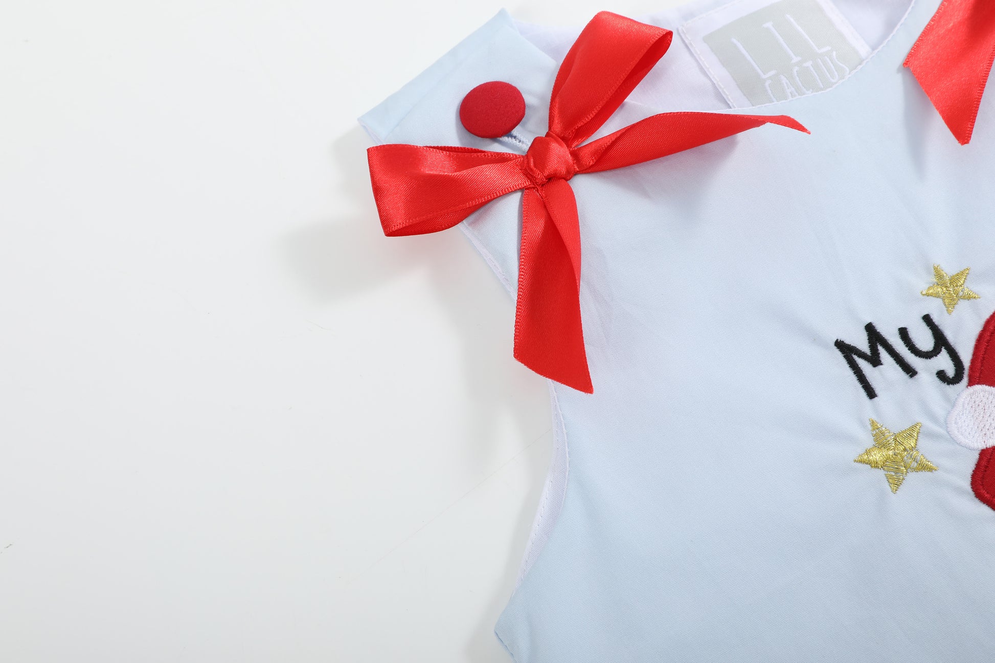 Celebrate your little one’s first Christmas in this adorable My 1st Christmas Jumper Dress. Featuring a charming "1st Christmas" applique on the front, along with two pretty red bows at each shoulder and coordinating buttons for adjustable sizing. Made from soft, breathable light blue cotton, this dress ensures comfort and a festive look. Perfect for creating cherished holiday memories. Available in 6-12M and 12-18M sizes.