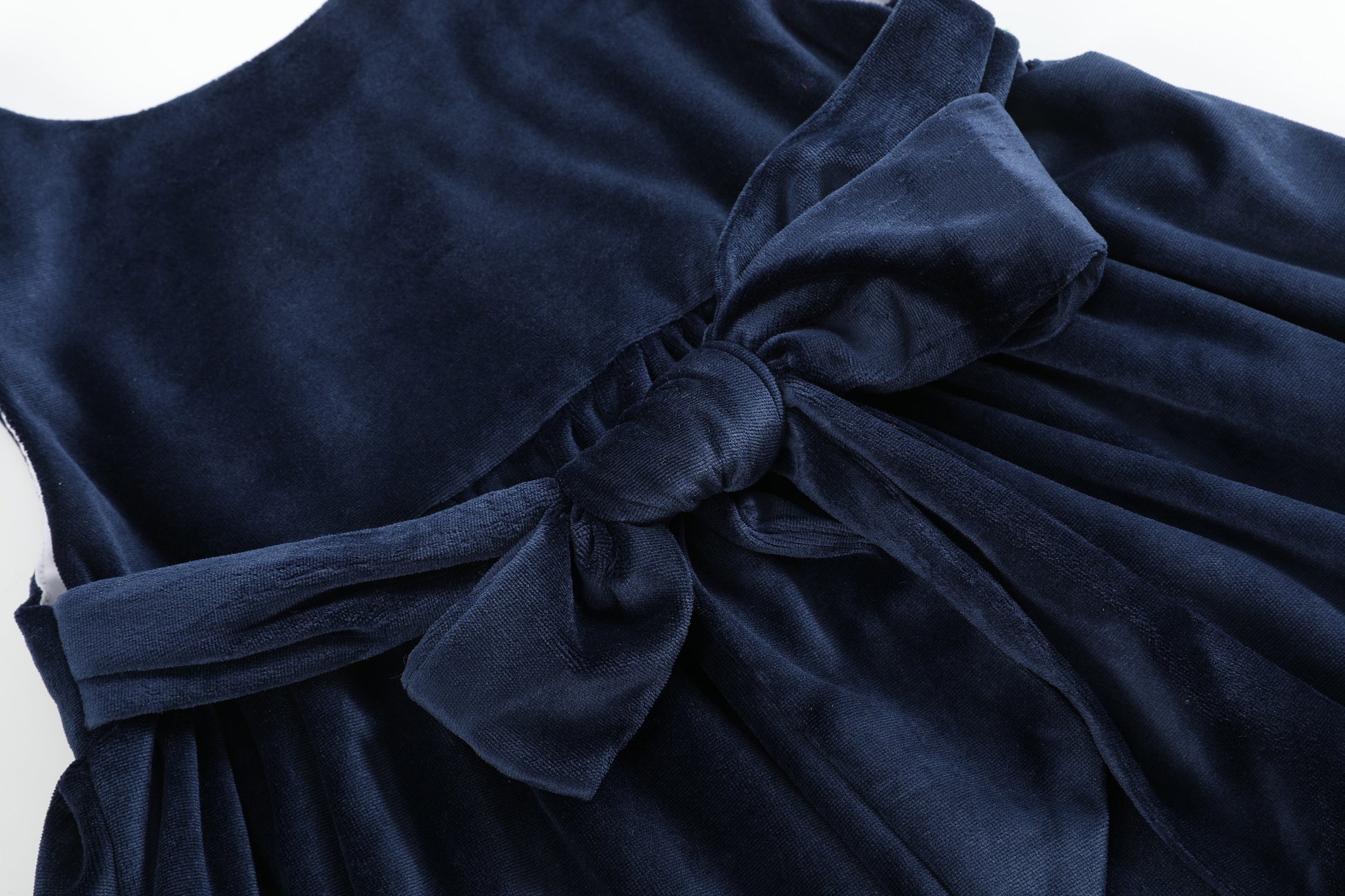 Dress your sweet girl up in holiday delight with our Navy Blue Velvet Santa Christmas Jumper Dress! Detailed with cute bows at the shoulders and featuring an adorable appliqué Santa's and Christmas trees, this dress is the perfect blend of festive cheer. In pretty blue velour, it's the ideal outfit for your little one to twirl through joyful celebrations with a touch of Christmas cuteness.