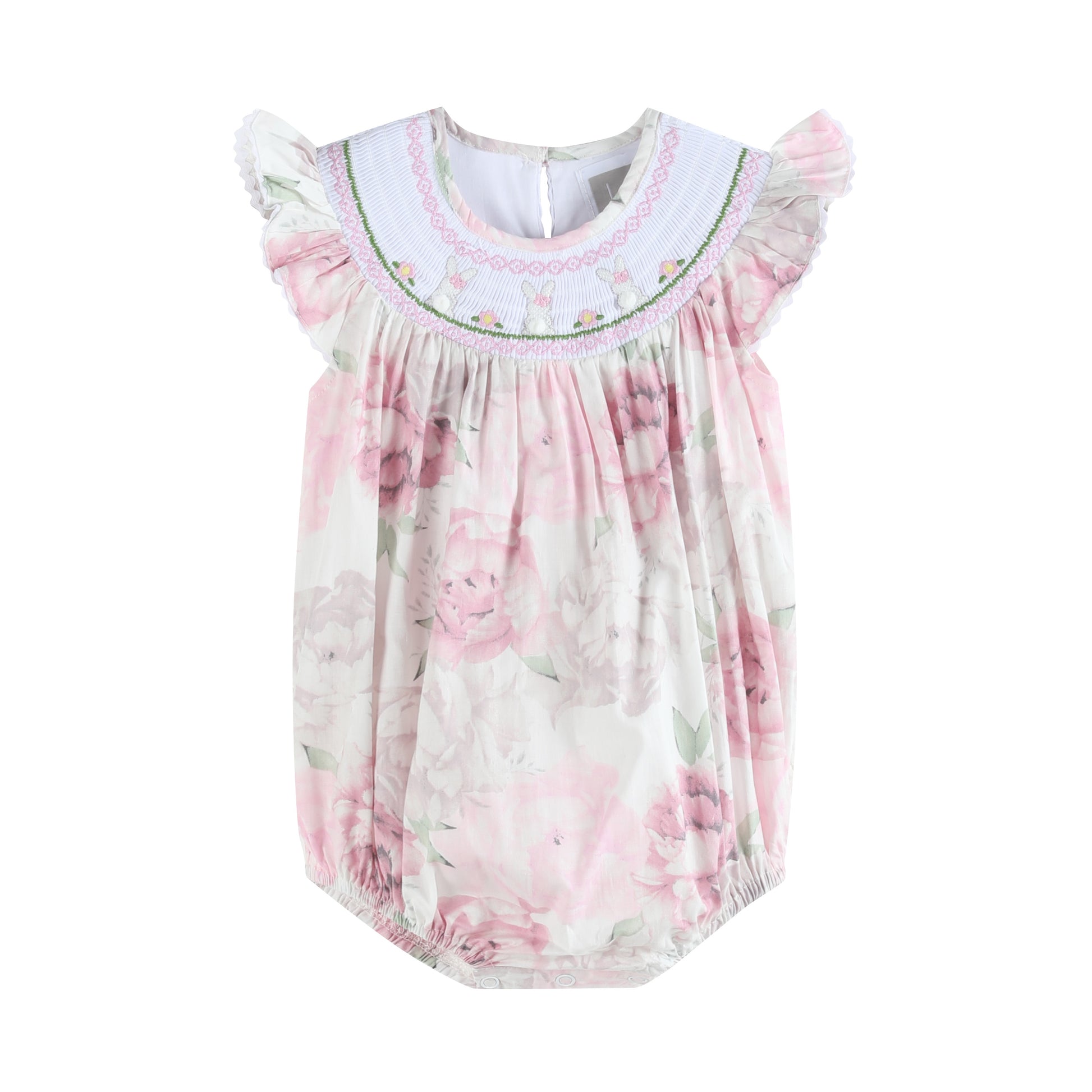Pink and White Peony Bunny Smocked Flutter Romper