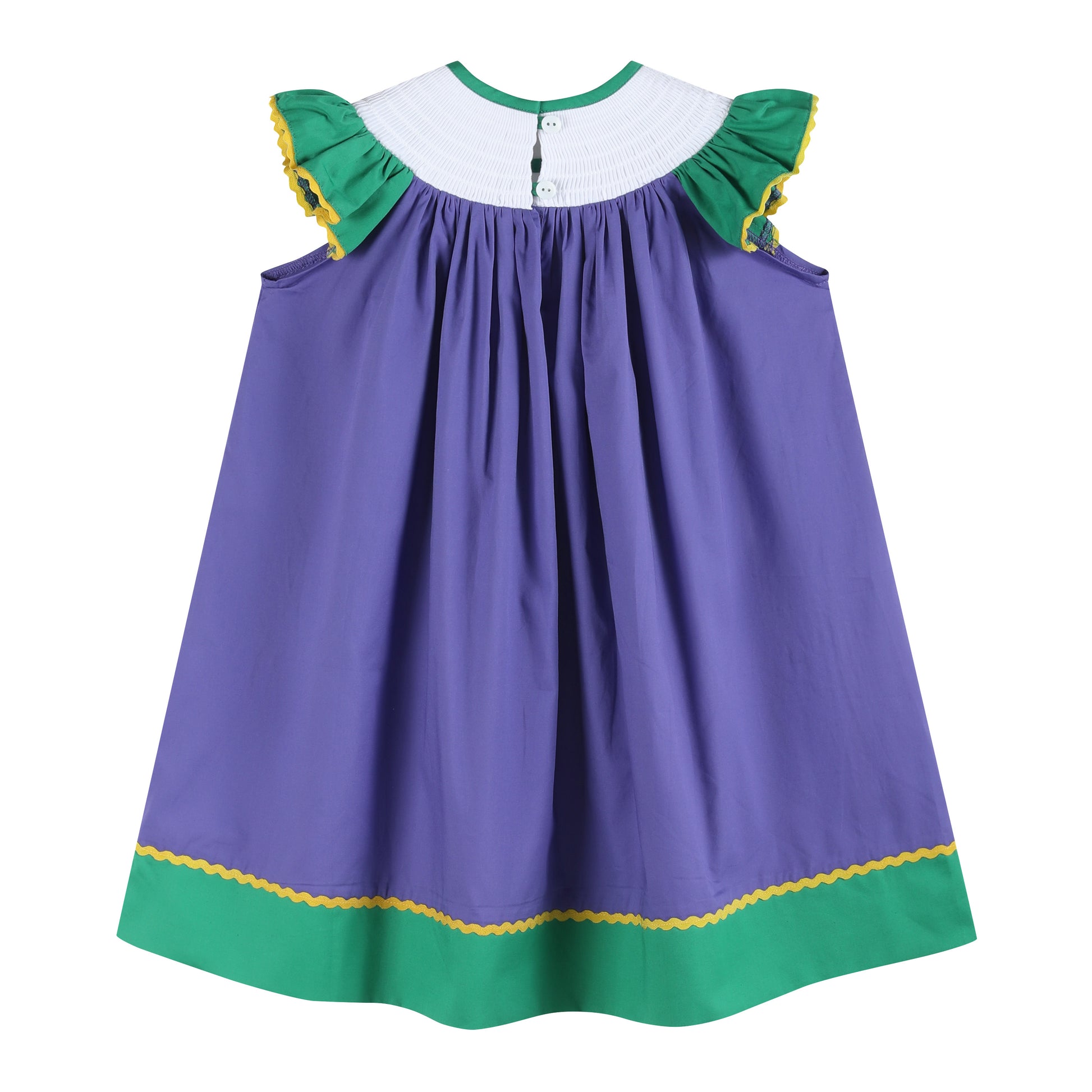 Let the good times roll in our festive Purple and Green Mardi Gras Smocked Bishop Dress! This vibrant purple dress features playful green flutter sleeves and cheerful yellow trim for a classic Mardi Gras color palette. The smocked neckline is embroidered with stars in purple, green, and golden yellow, bringing just the right amount of sparkle to her celebration style. Made from 100% cotton, it’s as comfortable as it is eye-catching, perfect for parades, parties, or playful everyday wear.