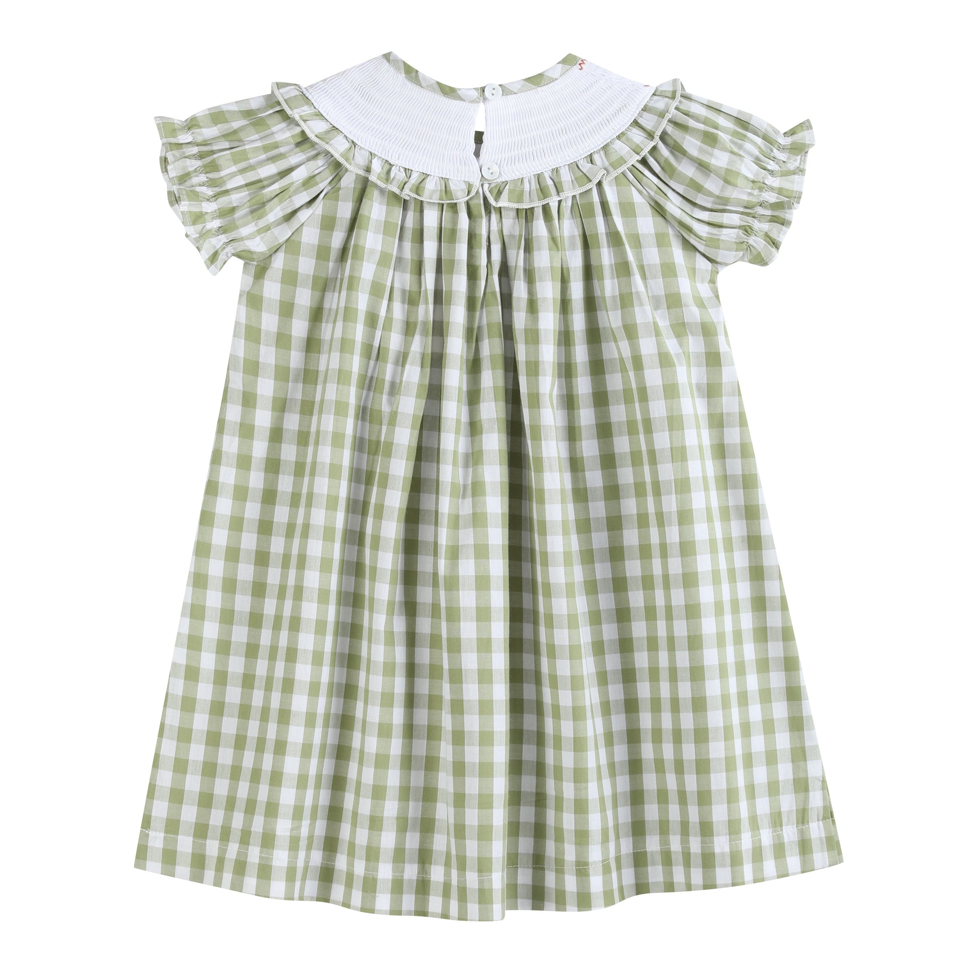 Pretty for Fall! This Sage Green Gingham Pumpkin Smocked Bishop Dress by Lil Cactus features cute pumpkin embroidery, smocking along the neckline that is details with an adorable ruffle. Made in 100% soft cotton to ensure your sweet girl is comfortable all day long. The perfect outfit for your cutie and all of her fall adventures. From playing in leaves to walking around the pumpkin patch; no matter the occasion she will be looking picture-perfect!