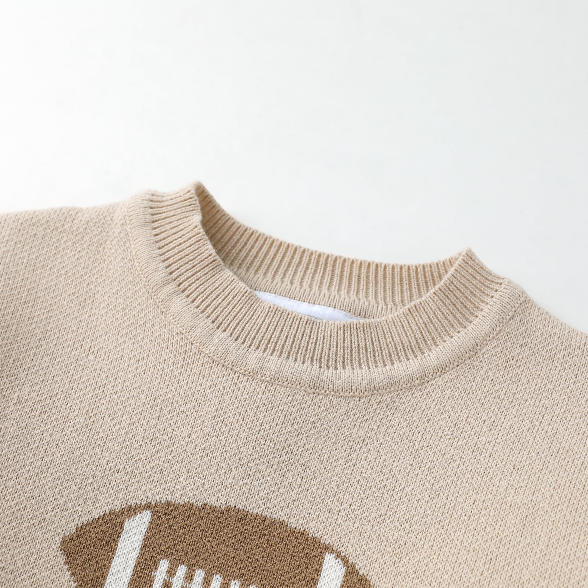 Score big on style with our Sand Beige Football Sweater! Featuring a playful football design, this cozy sweater is perfect for game days, fall outings, and Thanksgiving gatherings. The neutral sand beige color makes it easy to mix and match, while the sporty details add a festive seasonal touch. A winning look for your little one this fall!